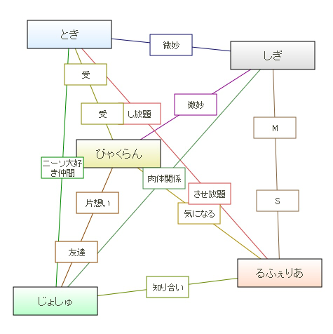 ふとPixivをうろうろしてたら相関図ジェネレータなんぞという懐かしいものを見かけたので、うちの子周辺でやってみた。